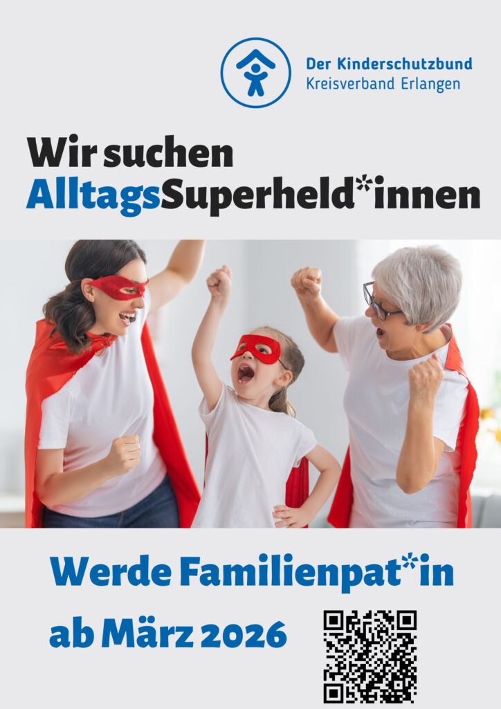 Sandkuchen backen, Bauklötze stapeln, Geschichten vorlesen oder einfach gut zuhören – oft sind es die kleinen Dinge, die für Familien eine große Hilfe bedeuten. Der Kinderschutzbund Erlangen sucht gemeinsam mit dem Landkreis Erlangen-Höchstadt engagierte „Superheld*innen des Alltags“, die mit Zeit, Herz und ihren ganz persönlichen Superkräften Familien und Alleinerziehende unterstützen möchten.