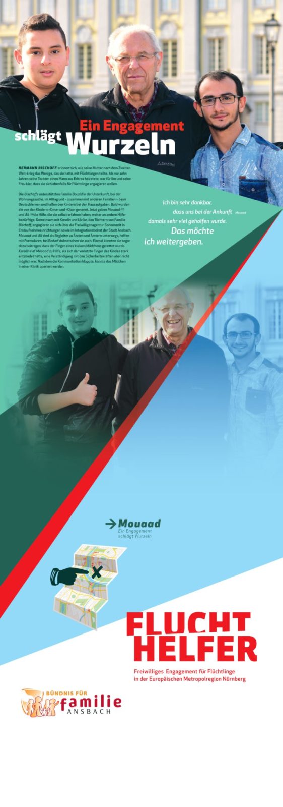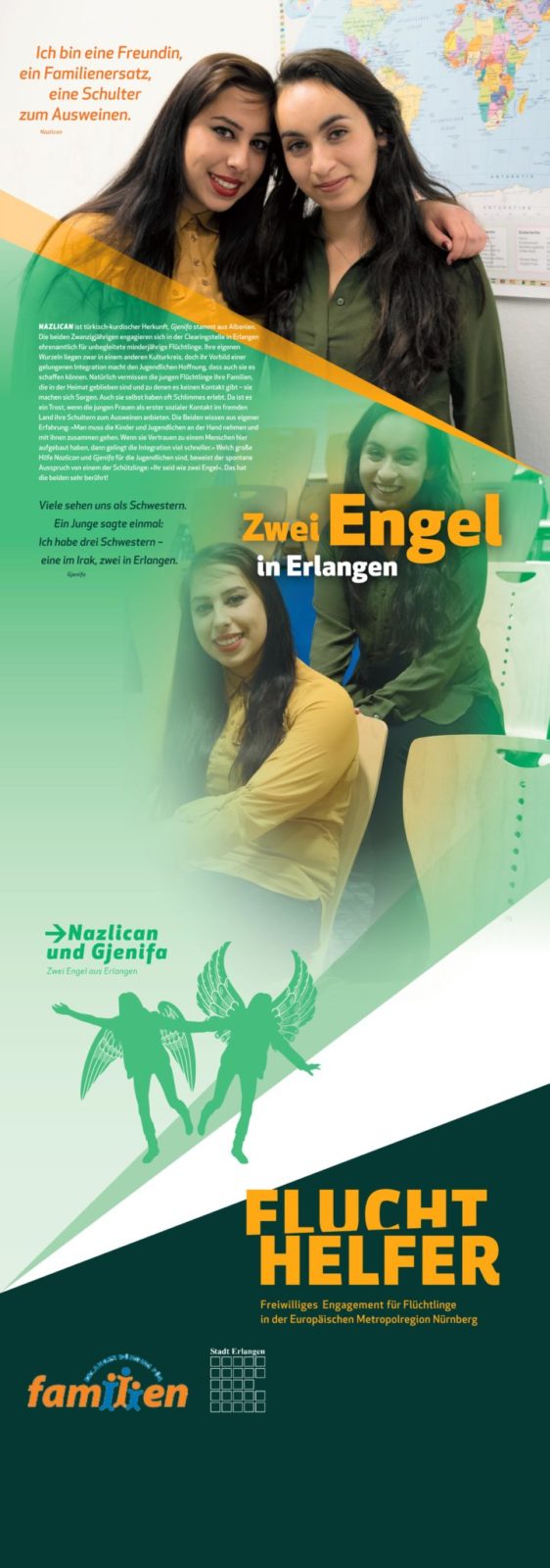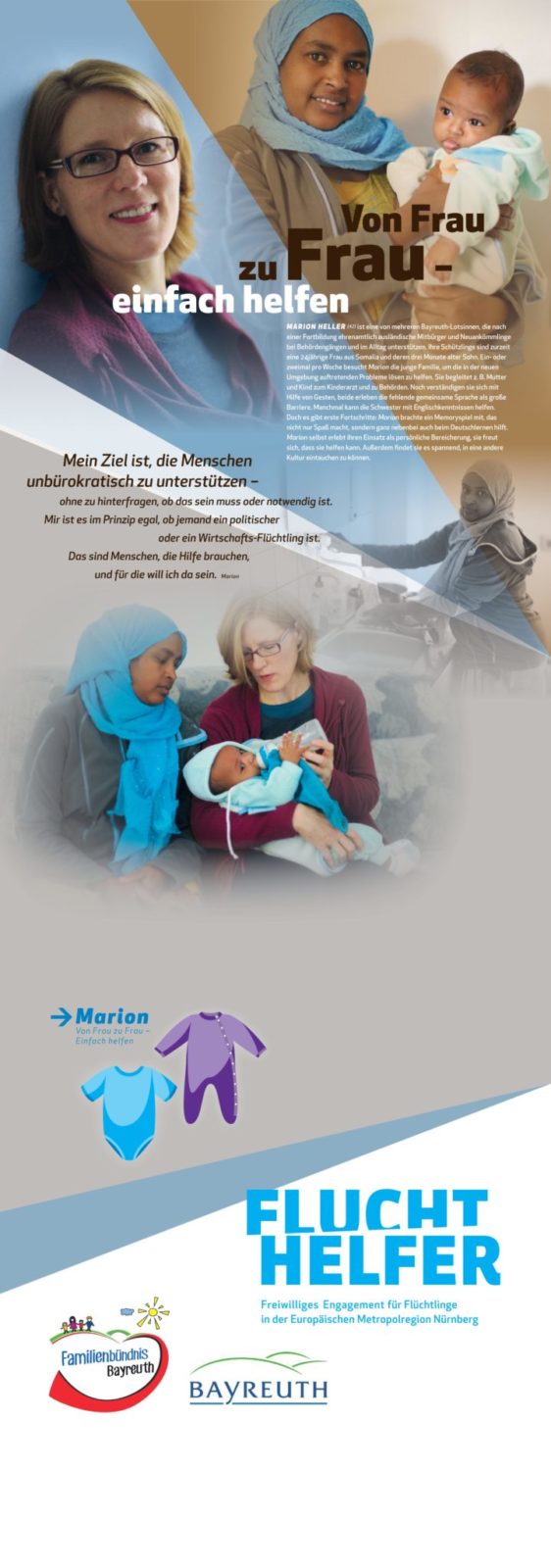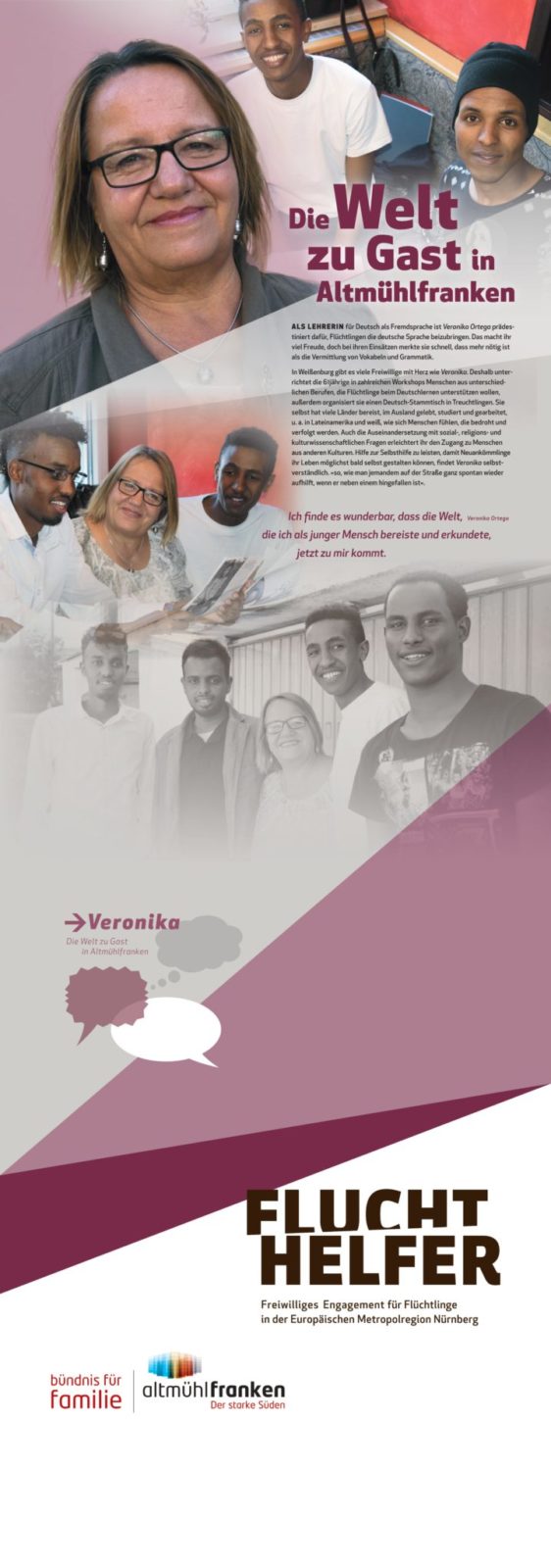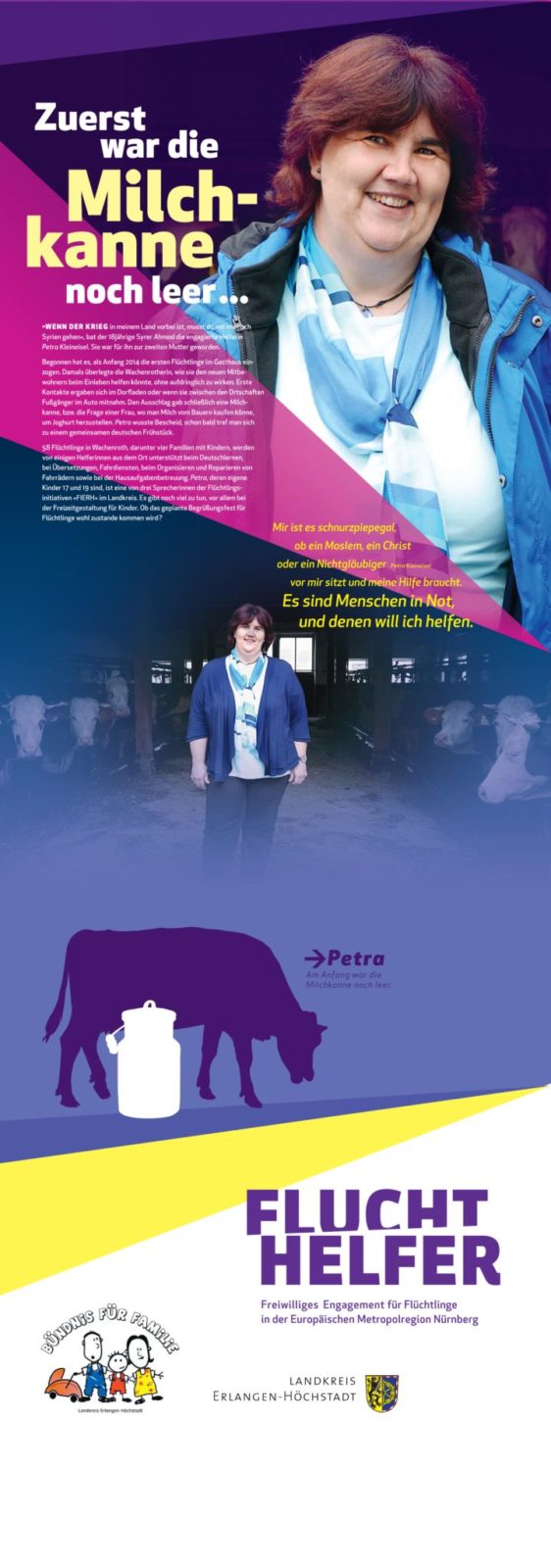 Wenn der Krieg in meinem Land vorbei ist, musst du mit mir nach Syrien gehen“, bittet der 18-jährige Syrer Ahmad die engagierte Helferin Petra Kleineisel. Die Wachenrotherin ist für ihn inzwischen zu seiner „Ersatzfamilie“ geworden. In der Wanderausstellung „FluchtHELFER“ der 15 „Bündnisse für Familie“ in der Europäischen Metropolregion Nürnberg, erzählt Petra Kleineisel ihre Geschichte als Helferin. Beispielhaft für die vielen Tausend Helferinnen und Helfer in der Region porträtiert die Ausstellung würdigend 22 Einzelpersonen, die sich freiwillig dafür engagieren, dass die Aufnahme und Eingliederung von Geflüchteten in den Kommunen gelingen kann. Die Art der Hilfe wirft zugleich Schlaglichter auf die Lage der Flüchtlinge – Familien, Alleinstehende, Kinder, Jugendliche – und verschafft dem Betrachter einen Eindruck über deren Situation.