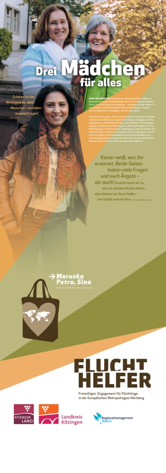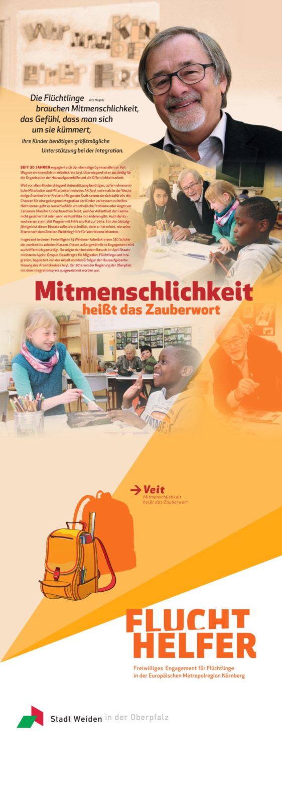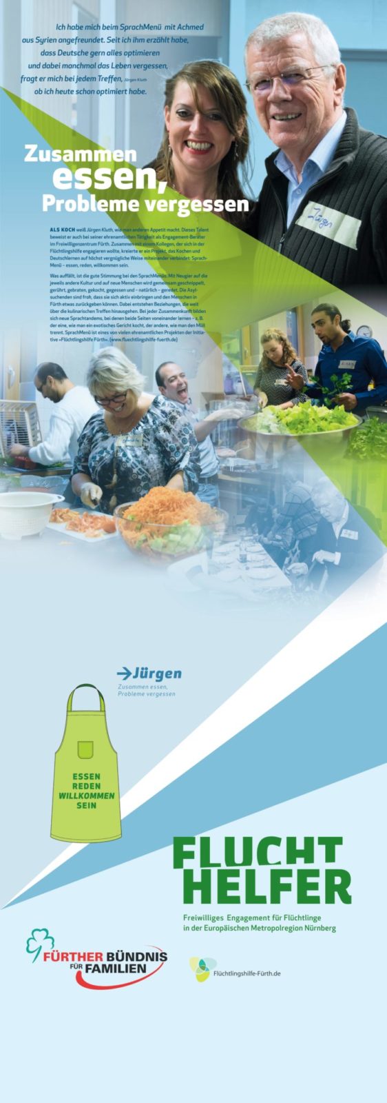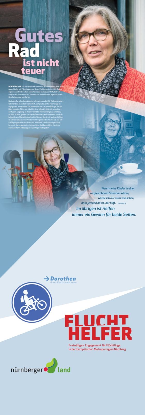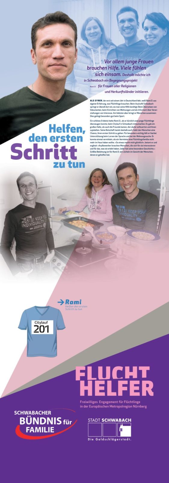 Wenn der Krieg in meinem Land vorbei ist, musst du mit mir nach Syrien gehen“, bittet der 18-jährige Syrer Ahmad die engagierte Helferin Petra Kleineisel. Die Wachenrotherin ist für ihn inzwischen zu seiner „Ersatzfamilie“ geworden. In der Wanderausstellung „FluchtHELFER“ der 15 „Bündnisse für Familie“ in der Europäischen Metropolregion Nürnberg, erzählt Petra Kleineisel ihre Geschichte als Helferin. Beispielhaft für die vielen Tausend Helferinnen und Helfer in der Region porträtiert die Ausstellung würdigend 22 Einzelpersonen, die sich freiwillig dafür engagieren, dass die Aufnahme und Eingliederung von Geflüchteten in den Kommunen gelingen kann. Die Art der Hilfe wirft zugleich Schlaglichter auf die Lage der Flüchtlinge – Familien, Alleinstehende, Kinder, Jugendliche – und verschafft dem Betrachter einen Eindruck über deren Situation.